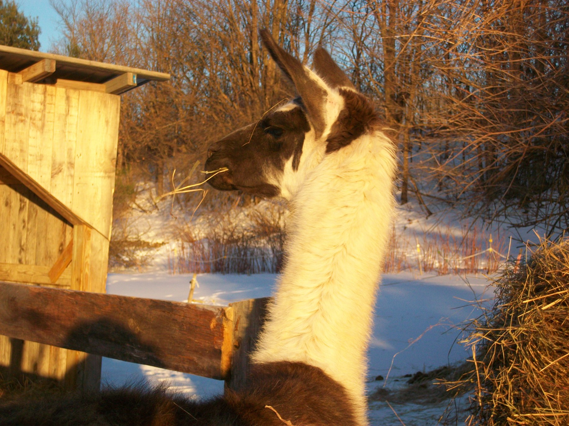 But we kept supporting Vanilla, and after five minutes he managed to get back on his feet and again, held his head very high in the air, more insulted than ever. So this is why I have a very grouchy llama, and I really can’t blame him. I did call the veterinarian and told her I just couldn’t give the ammonium chloride, and she is seeking to find a coated bolus that we could give him so the medication would reach his stomach without irritating him.