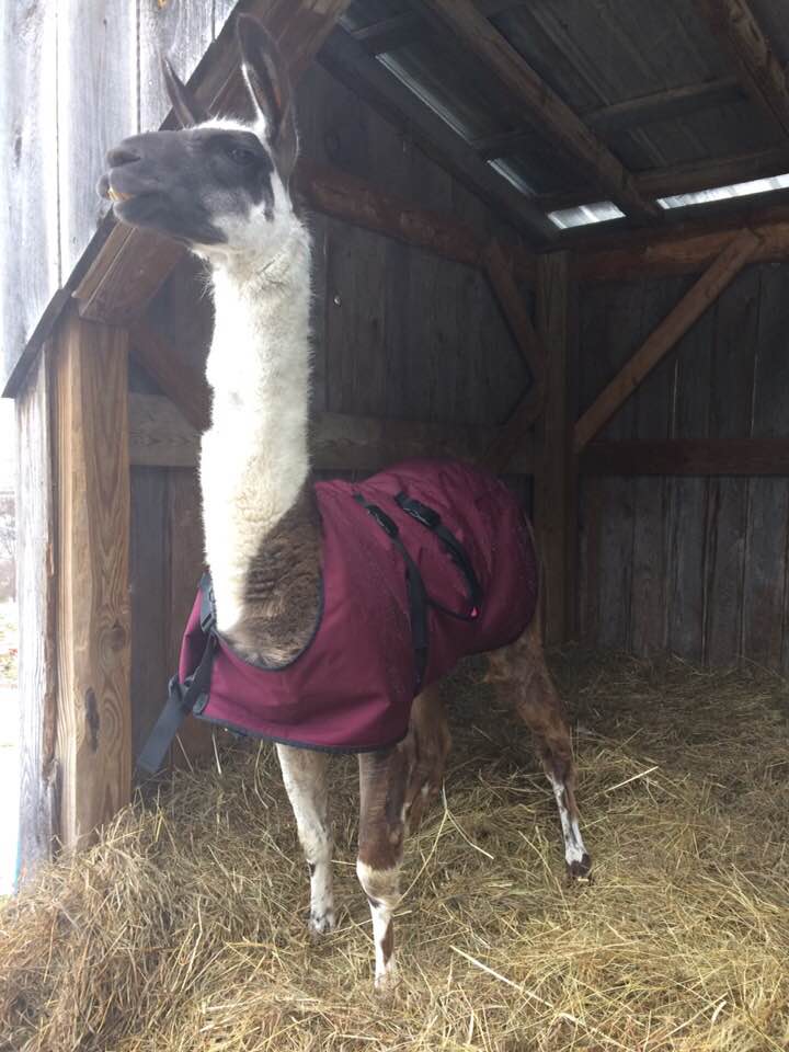He has a beautiful stature about him, very elegant, and he can be friendly. When he would come to me at night out of his pasture to get his special grain and a treat of an apple, he would always remind me of a unicorn coming out of the twilight. Something magical about him. Now he has his llama coat, and his well-bedded stall, and his medications, and me and friends of mine – brave friends! – come to help me straighten out his blanket to keep it in the proper position. And I hope he will return to being a healthy llama.