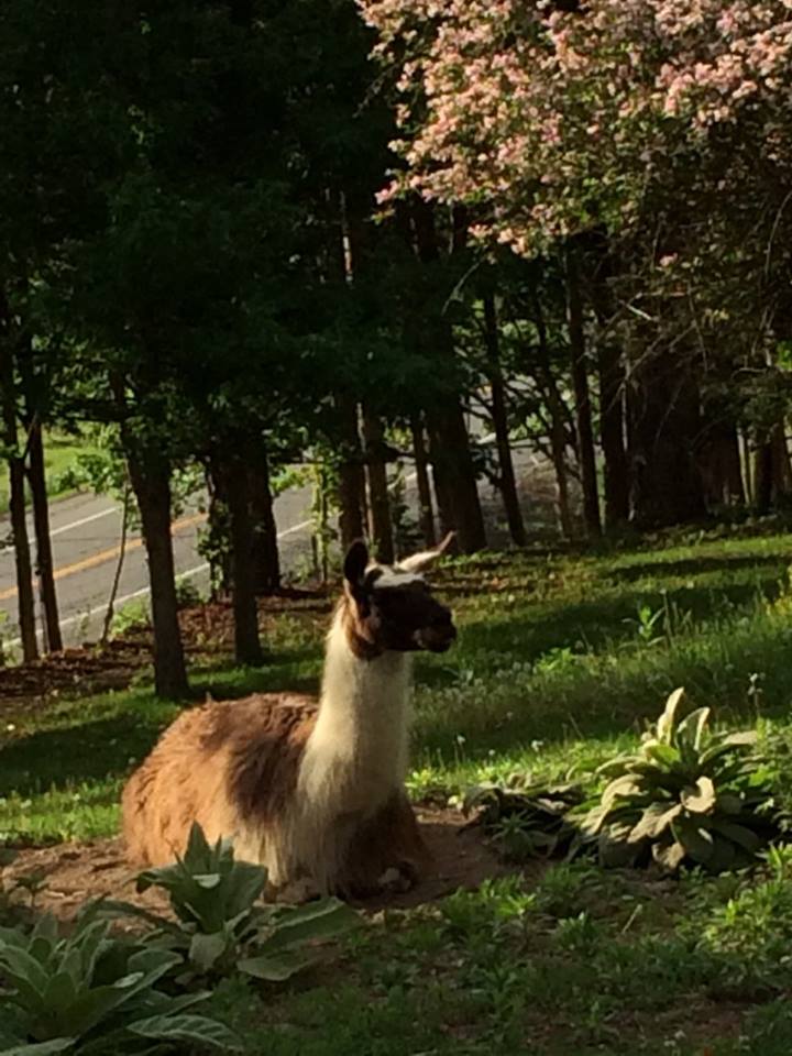 I had a visit this past week from Maria Wulf and Jon Katz in preparation for their Bedlam Farm Open House event this weekend (info on my Events Page). It was fun to share my batik art with Maria and Jon and have Maria select some of my work to be shown in her studio during the Open House. And it was a lot of fun showing them my animals! My good old cow Steppin Up and fun loving llama Vanilla, who was very grouchy that day after having been moved out of his shed for a brief time. Fortunately, Maria is his favorite person and he perked up and gave her a kiss.