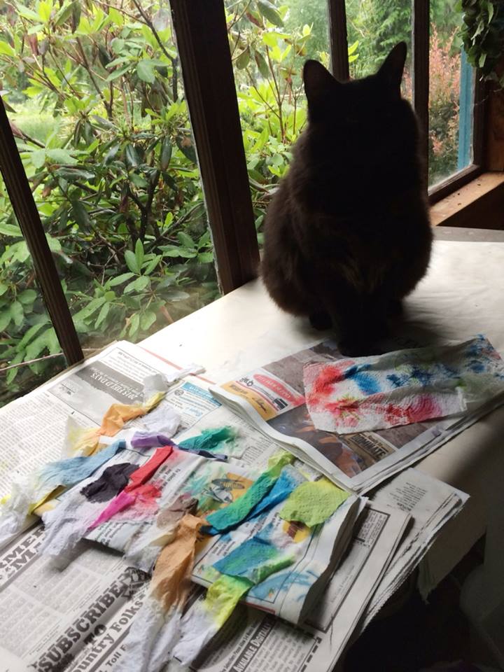 - Black Shadow examines my test strips for dye baths I’m getting ready to use