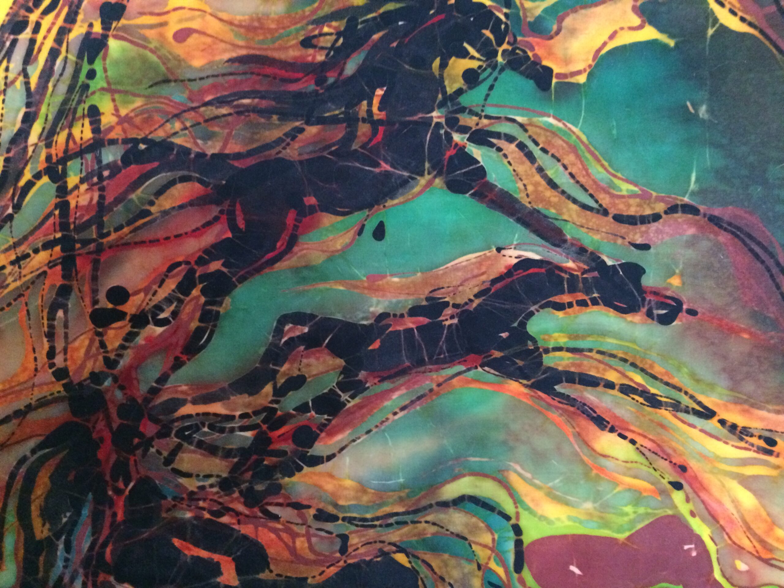 Anyway, moving on, my Caught in the Thunderstorm batik portrays Nature’s power in the sky. The dark horses in the top part are darting in the wind as lightning and thunder. The red horse hides below, waiting for the storm to pass.