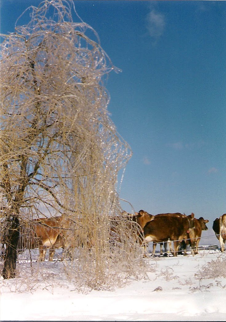 I think back to those mornings on the farm when I would go out and see the hutch calves with frosted faces, heifers with muzzles and ears tinged in white, and my two Morgan mares with their long manes spilling over with the devil frost They would all be frisy, happily diving into their food. The milking cows would be in their stalls until late morning when they too would go outdoors, to romp in the snow and eat until the time came for the evening milking.