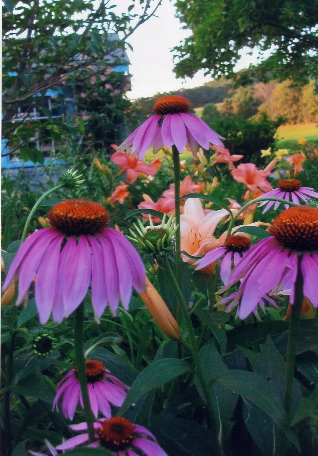 Near the house the coneflowers look brilliant, accented by their irridescent centers. The large old trumpet vine is in full bloom making hummingbirds and bees very happy. I find myself flooded with ideas and images for my batik work. I’m glad for the inspiration, but can not hope to achieve such beauty as is found in nature.