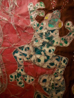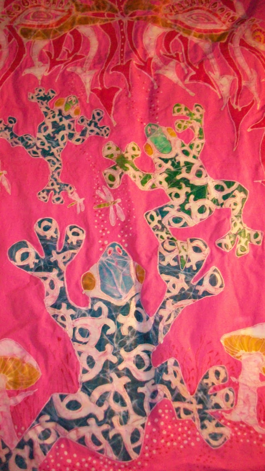 Dyeing the fabric outdoors is ideal and I have my flower sink for you to see where I like to rinse the excess dye out of my batik pieces. I also wanted to show you some stages of the batik “Magic Frogs Rising” through the pond, up out of the earth below. See an early image of wax applied after two previous dyebaths. Then a close up of the design before it’s last dyebath ( see the heavy wax layer). A close up of the batik in the final dyebath on the porch is seen in a long shallow dye tray. The long dye tray keeps this large piece from becoming over crackled. The “Magic Frogs Rising” batik is 26 by 40 inches. Finally, here the top of this batik is seen after the wax is ironed out between plain newsprint.