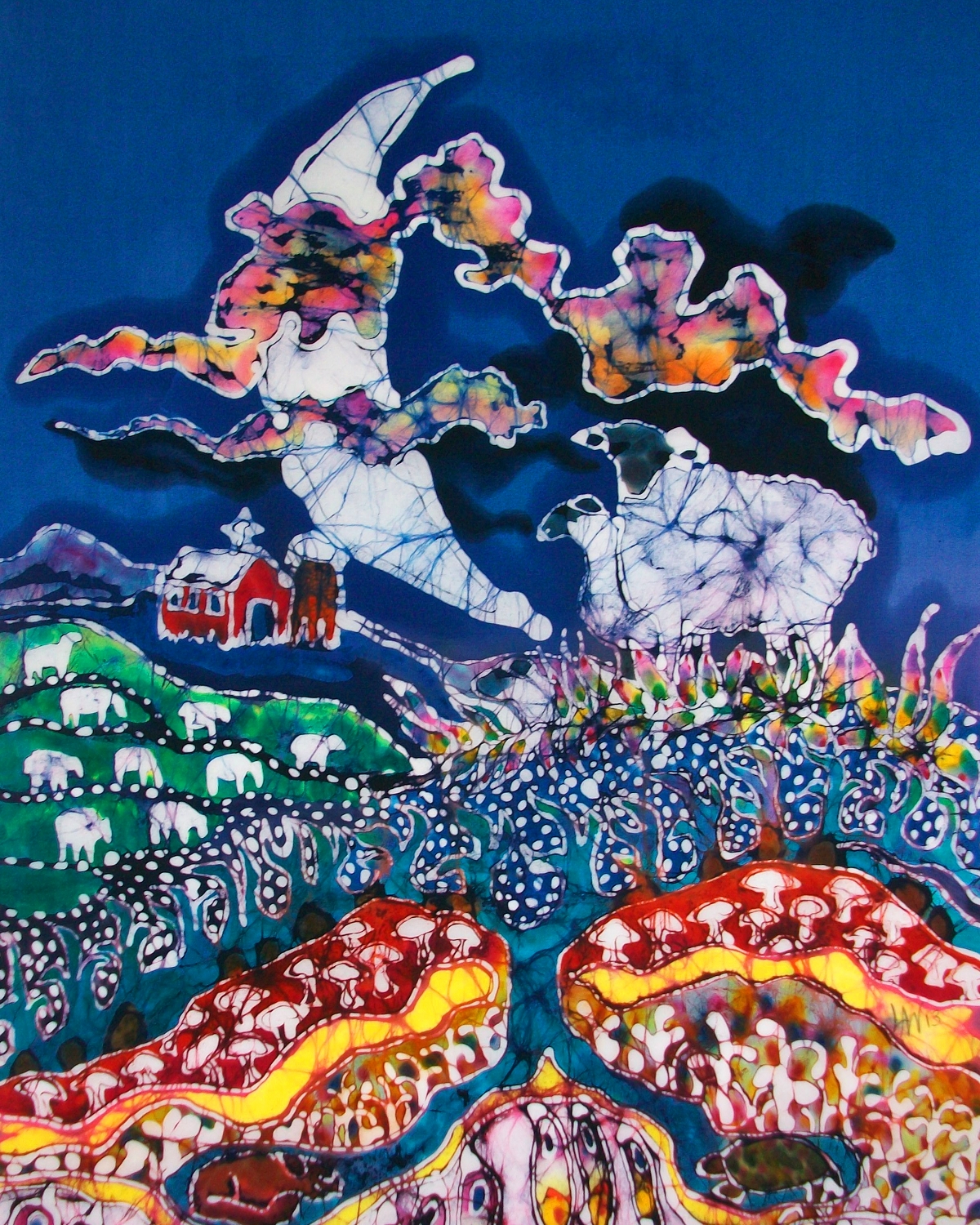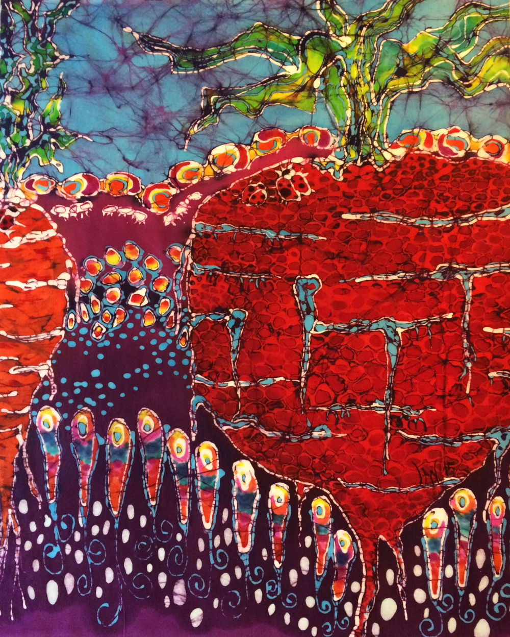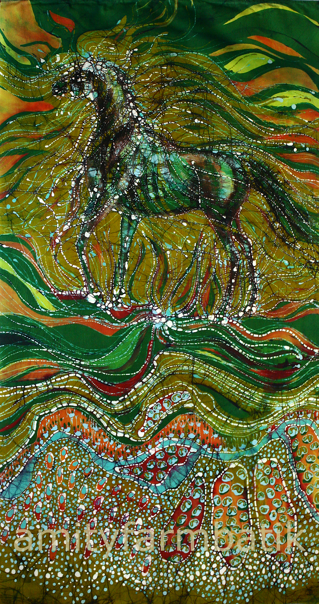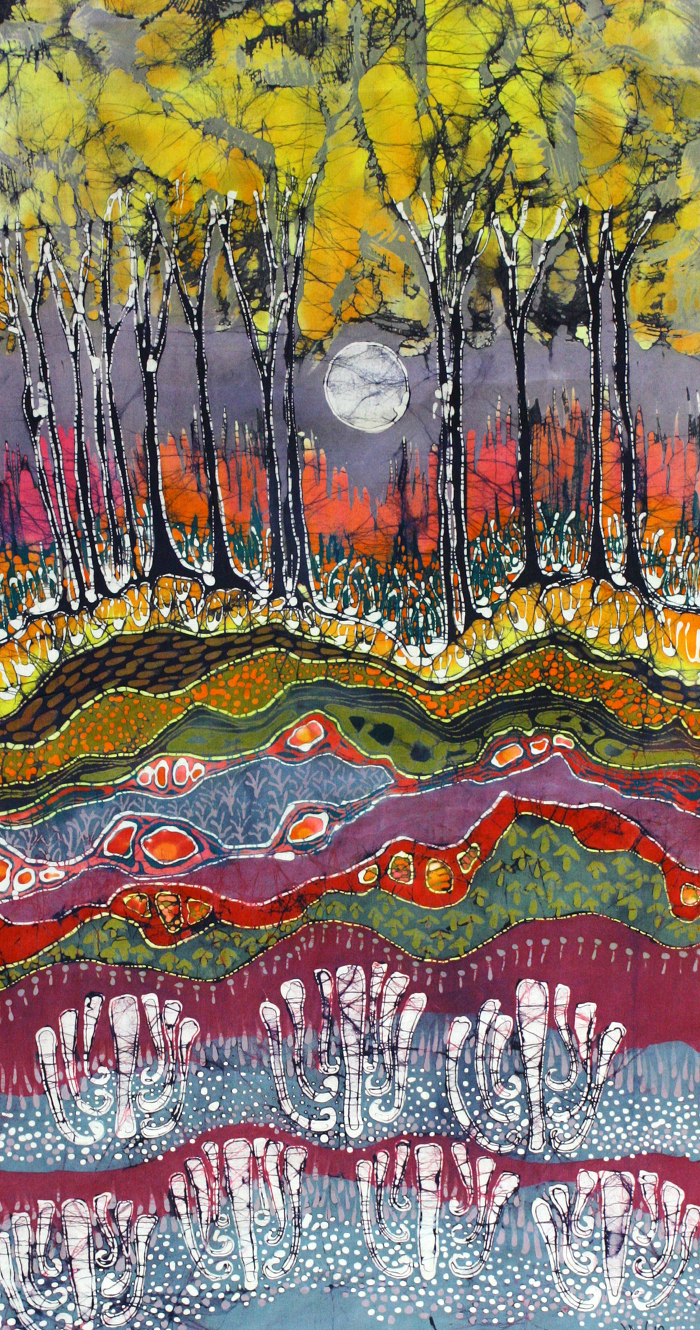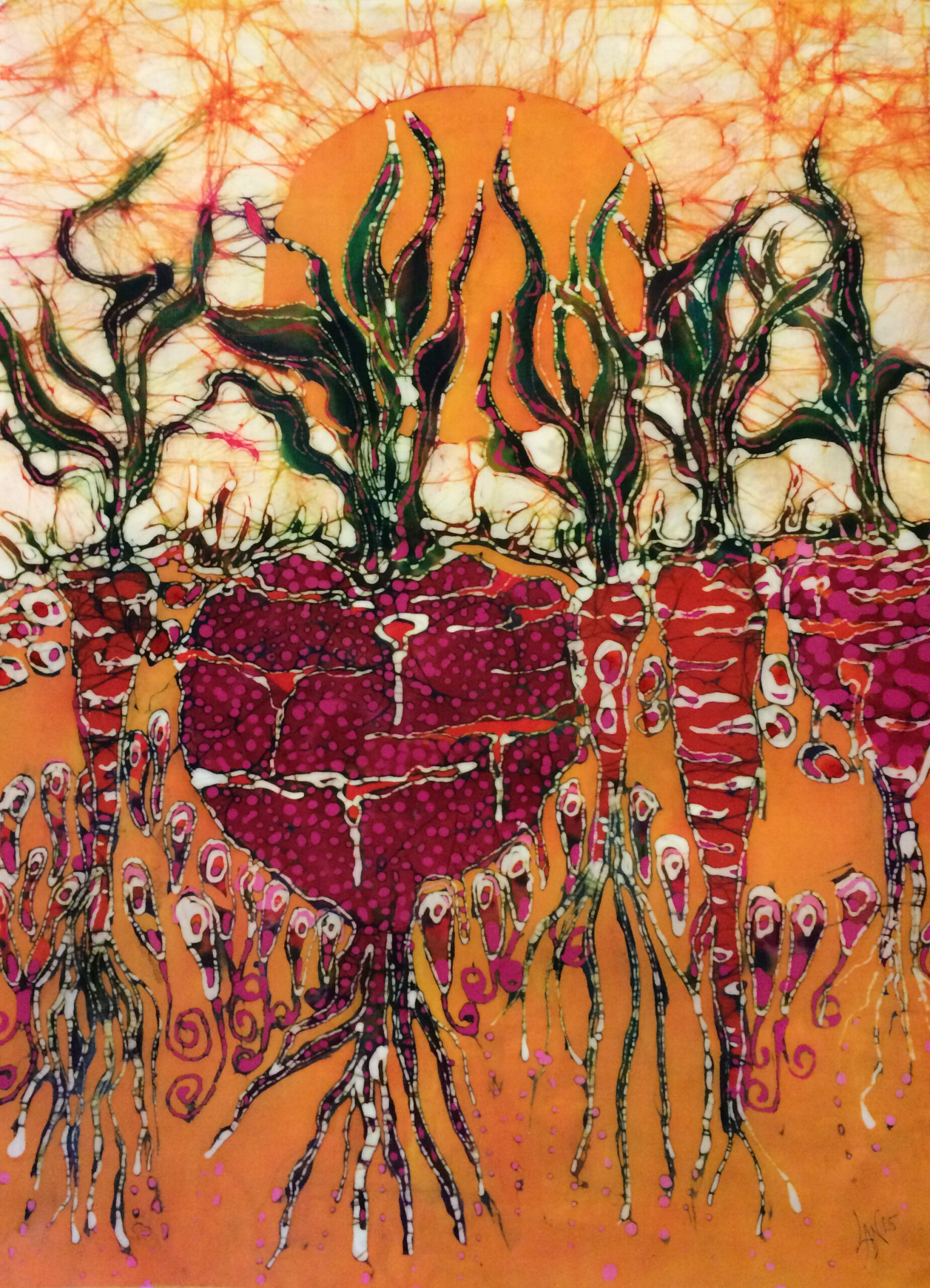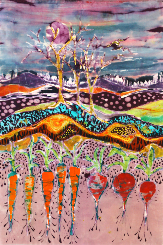 The connection to the earth for me is something that spilled over into my art, and I have done many batik showing the below ground energy, which I can feel now beneath my feet. Some of those batiks are Moonlight Over Spring, Vegetables After the Thunderstorm, Green Horse Rises From the Earth and Merges with the Wind and many vegetable garden batik you see below with the magic energy from the earth showing as beautiful particles interwoven with the roots of carrots and beets.