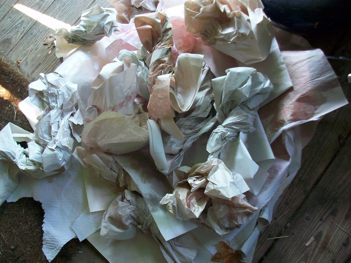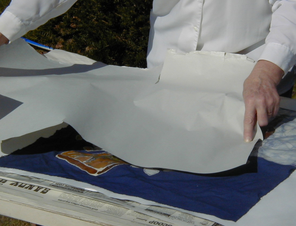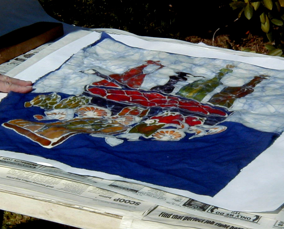 The batik below is a still life of one of my favorite things – food and the kitchen! – and is shown here with wax still on it, and with the process of ironing the wax out shown below. Plain newsprint or plain paper towel has to be placed next to the original batik. Then, discarded newspapers may be added to absorb the extra wax. The wax is then ironed out between this paper and must be changed several times as it becomes saturated with wax. Eventually, all the wax that can be ironed out will have been removed and I will be left with a pile of discarded papers that you can see on the right. Clean up time!