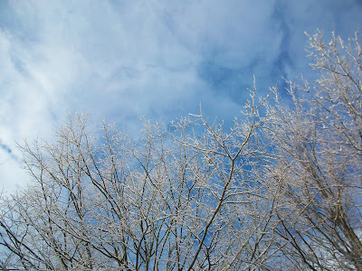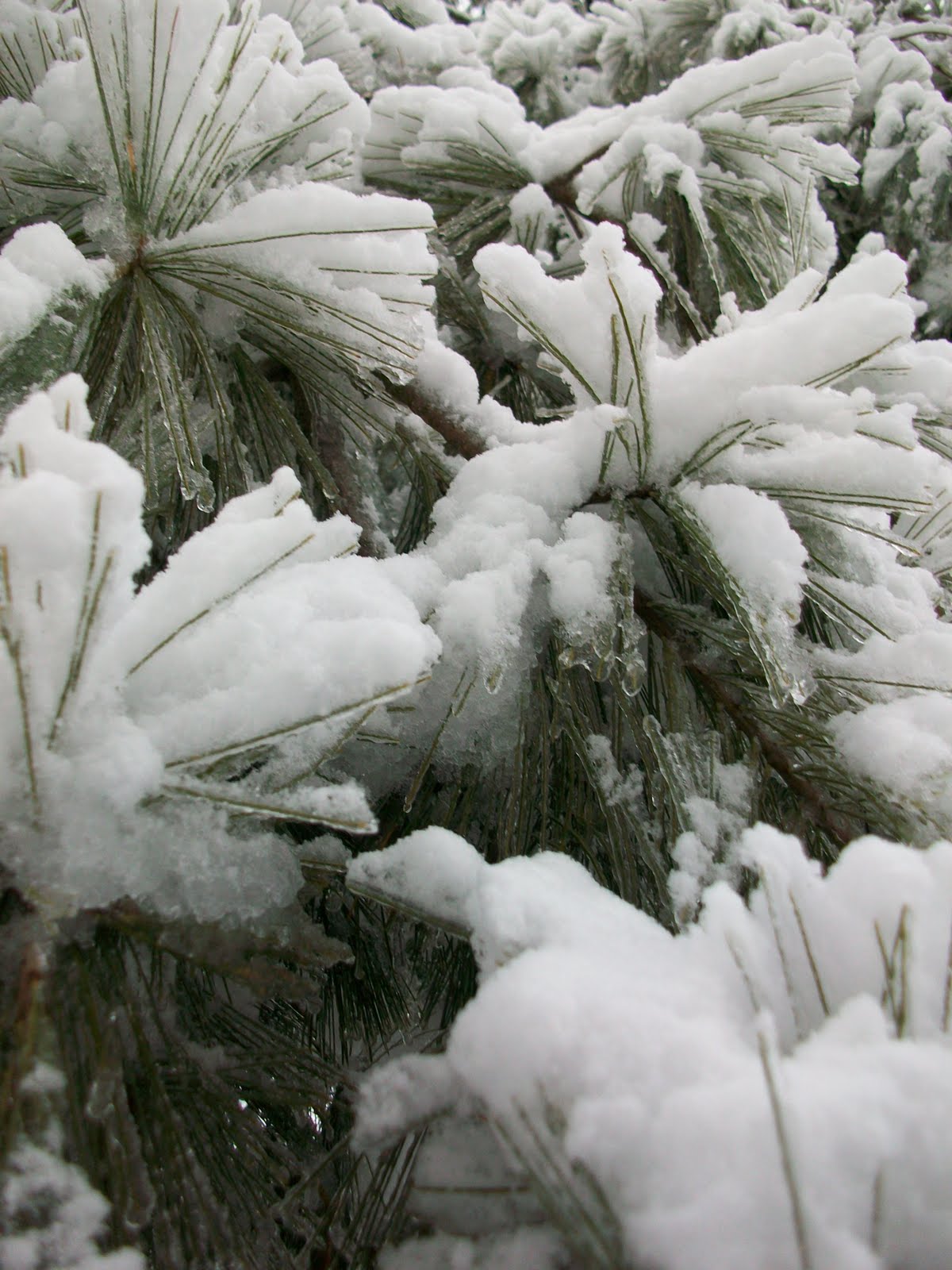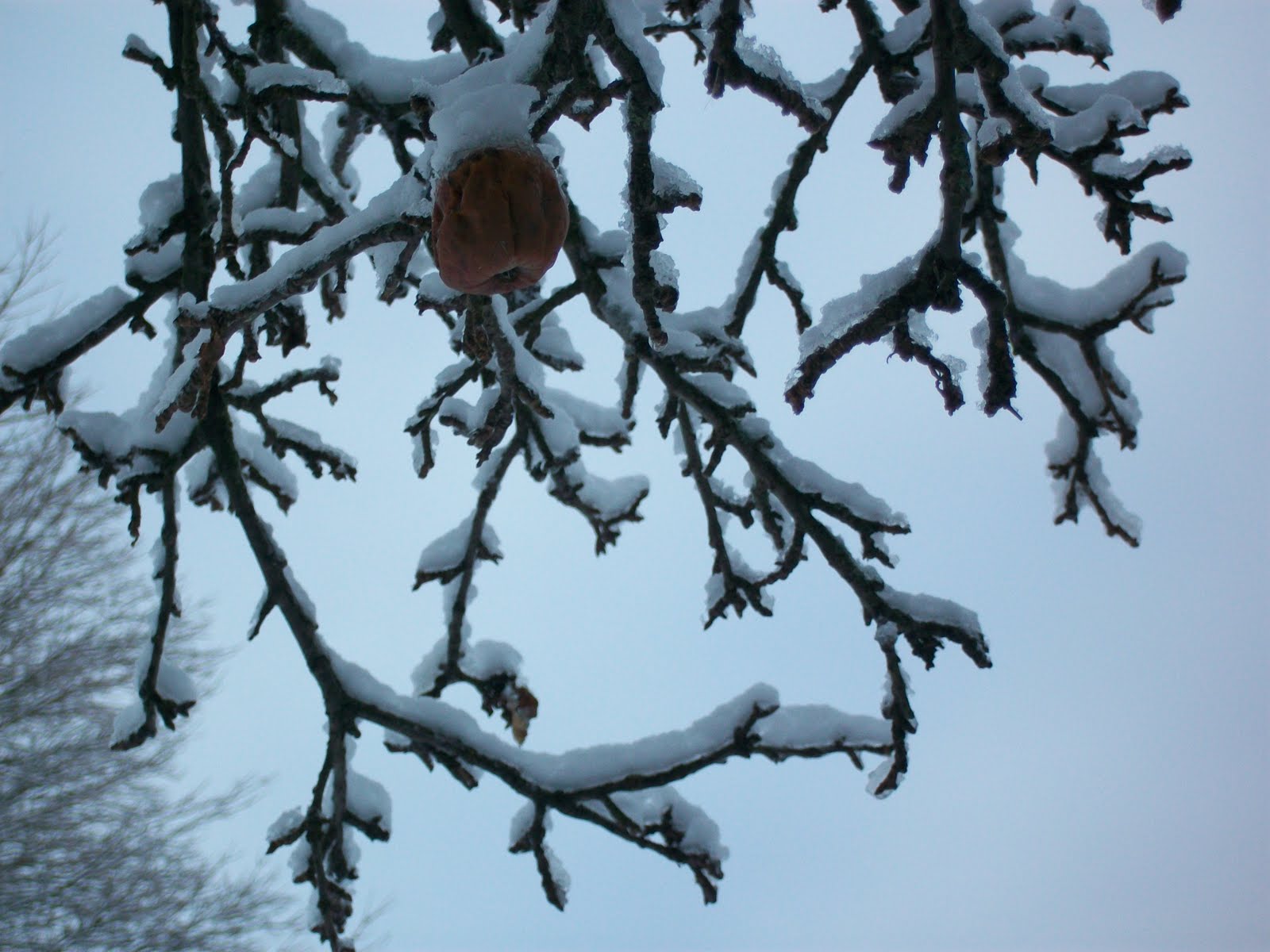 Looking up brilliant, looking west a bit dark and foreboding. The little birdhouse on the old tree by the house had icicles hanging from it. I walked on and the great pine tree in the field to our south was covered and bent but taking it well. The snow and needles made a great textural pattern. A little farther on was an old apple tree that had some small shriveled apples still on it. This tree had been feeding deer since November.