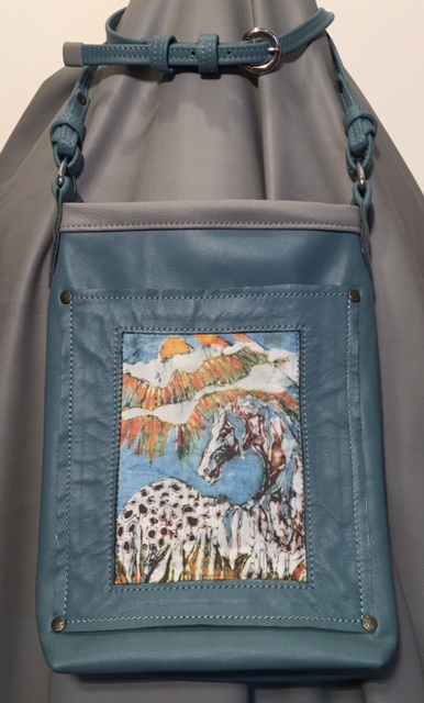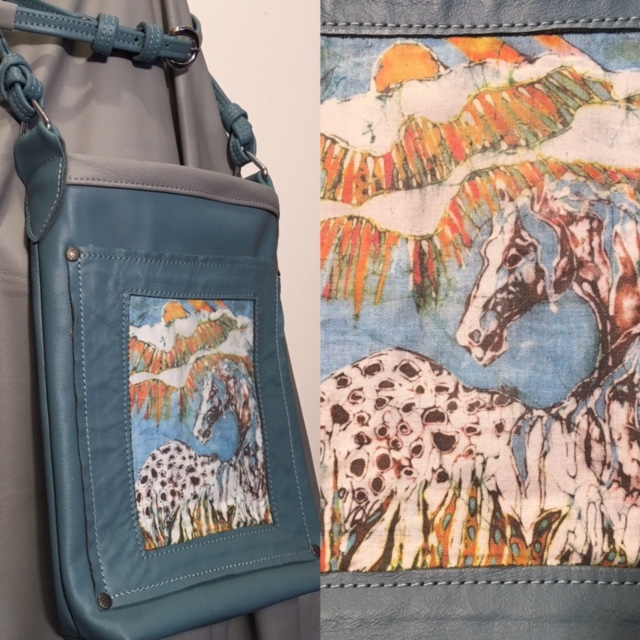 Dara James Designs has begun to get some of my fabrics and is incorporating them into leather purses especially designed for horse lovers. I have enclosed a photo of her purse with my batik “Appaloosa in Sun Rays”. She will be doing lots more of these purses using my horse artwork.