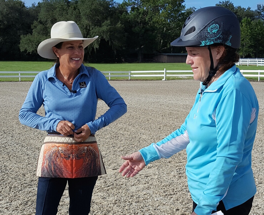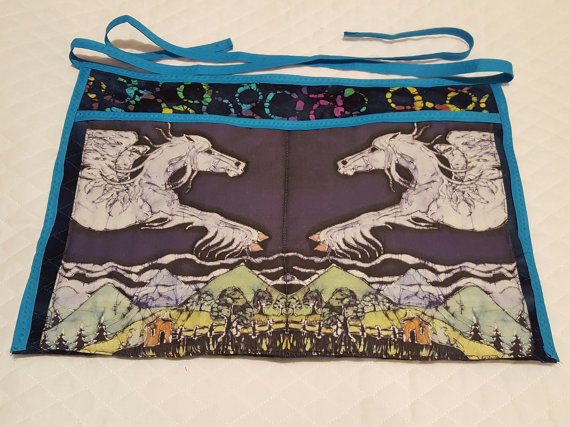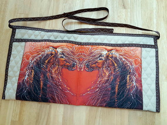 Pat Davis of My Buddy Bling on Etsy is another horse lover who has bought many of my fabrics and made useful items out of them: Aprons of different kinds; she can make purses and she makes a lot of really delightful things for horses to wear! Horse jewelry, horse halloween outfits and more. She has a really fun shop and she gave the Autumn Sundance apron to Julie Goodnight, who is a horse trainer and clinician.