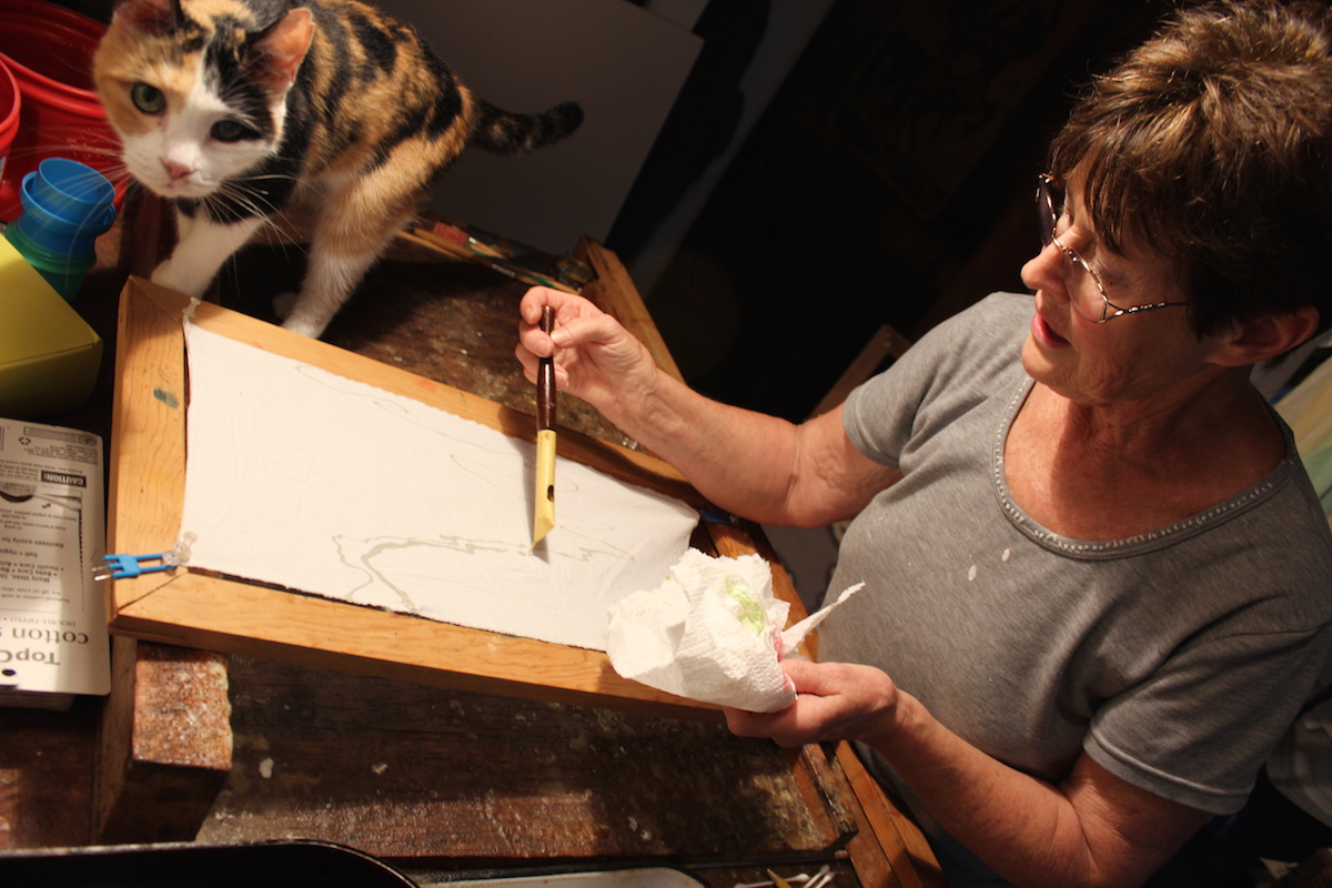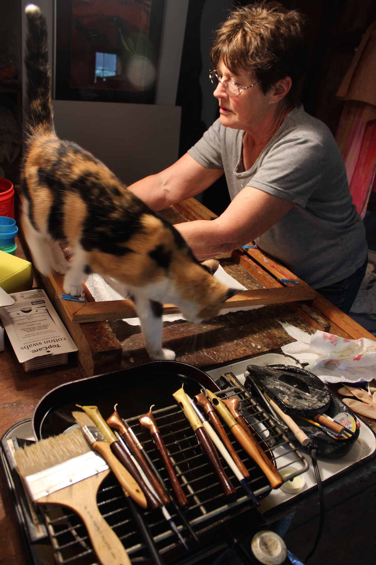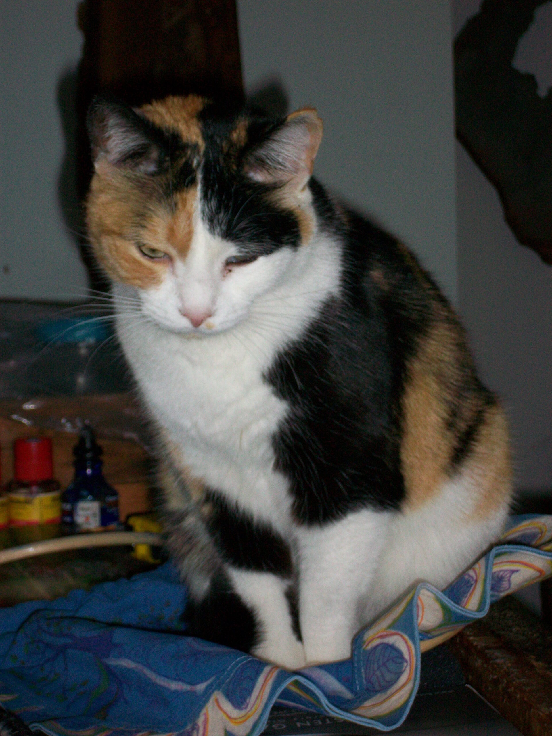 Since then, Singer has been my studio cat. She was fascinated by me using the tjanting tool that makes lines of wax on my fabric and watched intently as I developed my designs. Singer has been very active but two years ago developed a hyperthyroid condition and has been getting medication twice a day for it since then. She also developed kidney problems. Her appetite has been poor, and she never was a great eater, very fussy. In spite of being very thin, she persisted at being active and seemed to be purring happily a good deal of the time, and continued to enjoy watching me do my artwork.