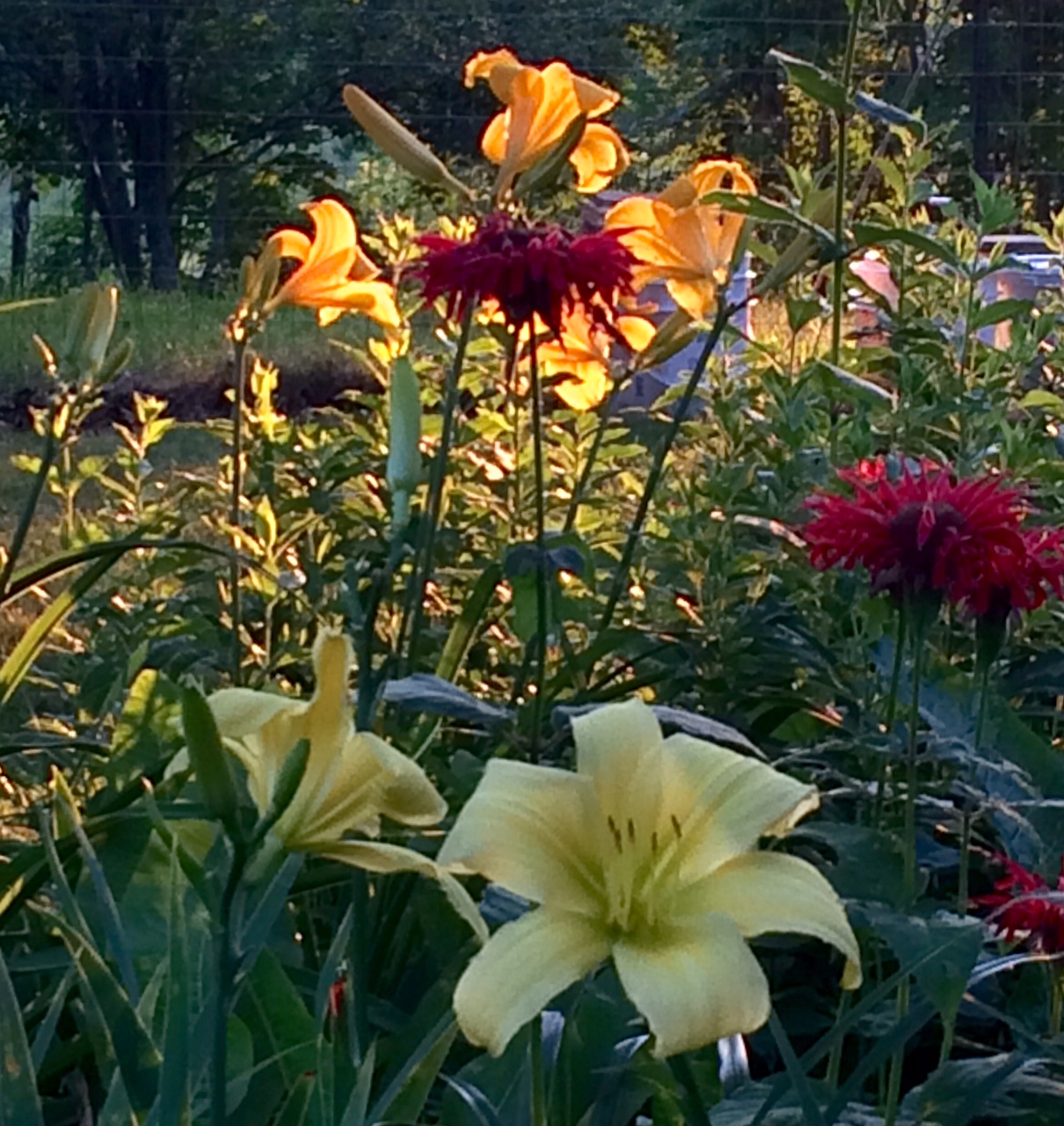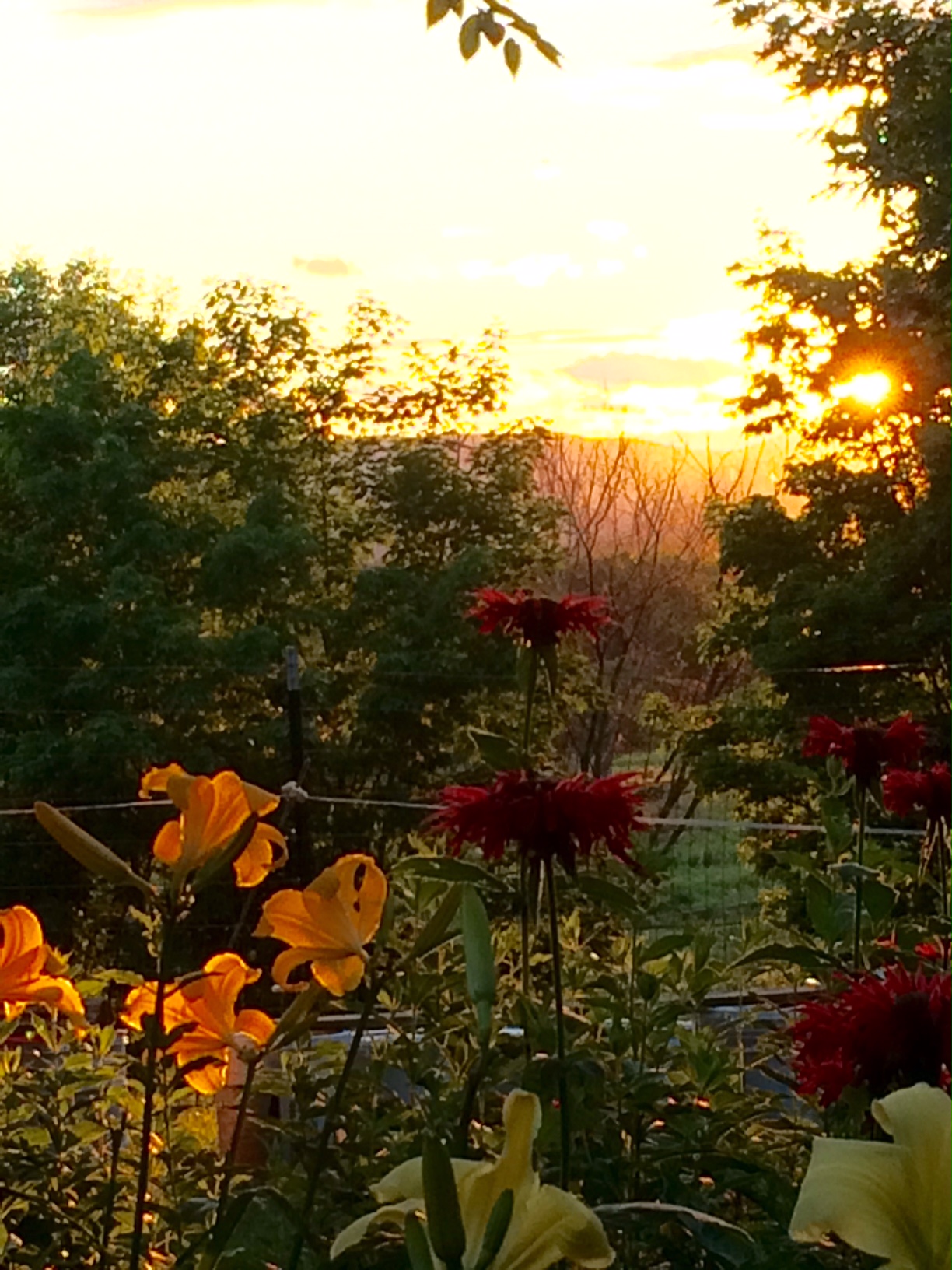 The yard outside our old house has been bursting with daylilies and other flowers, and I have just been swept away with the beauty of them. My favorite time to take a walk is at sunset time, and the light here comes in from the West and bathes everything in the golden light. It’s actually euphoric to me. I find that instead of being up in my studio painting wax on my fabrics, I’m outside taking pictures all the time, and I love sharing them.