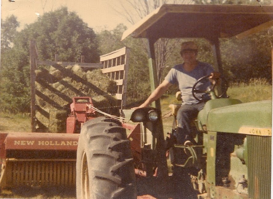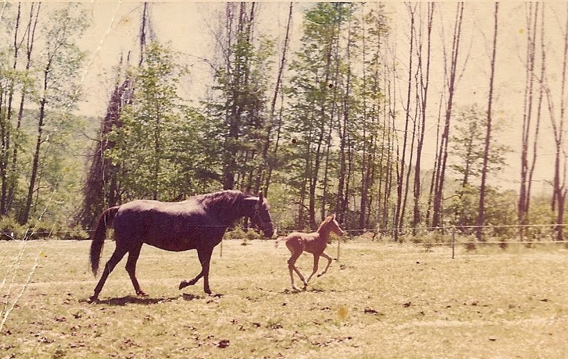 My Morgan mare, Amity (means friendship), gave her name to our jersey cow dairy. Such a beautiful farm filled with wonderful memories. See photo here of Amity with her baby daughter, Maya. The pictures show our herd greeter, Sadie, cows grazing below trees with barns and house in background, me, feeding a baby calf, and my husband,Dick, on the tractor baling hay and happy to be harvesting early spring feed for our jersey cows.