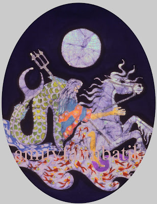 I’m including an image of “Moon Over Spring” as well as several other batik that are inspired by moonlight. “The Unicorn and Phoenix”, “Pan Calls the Moon from Zebra’s Back”, “Poseidon Rides the Sea”, and “Dragon Breathing Arrows around Moon”. The full moon has been an inspirational symbol for all time.