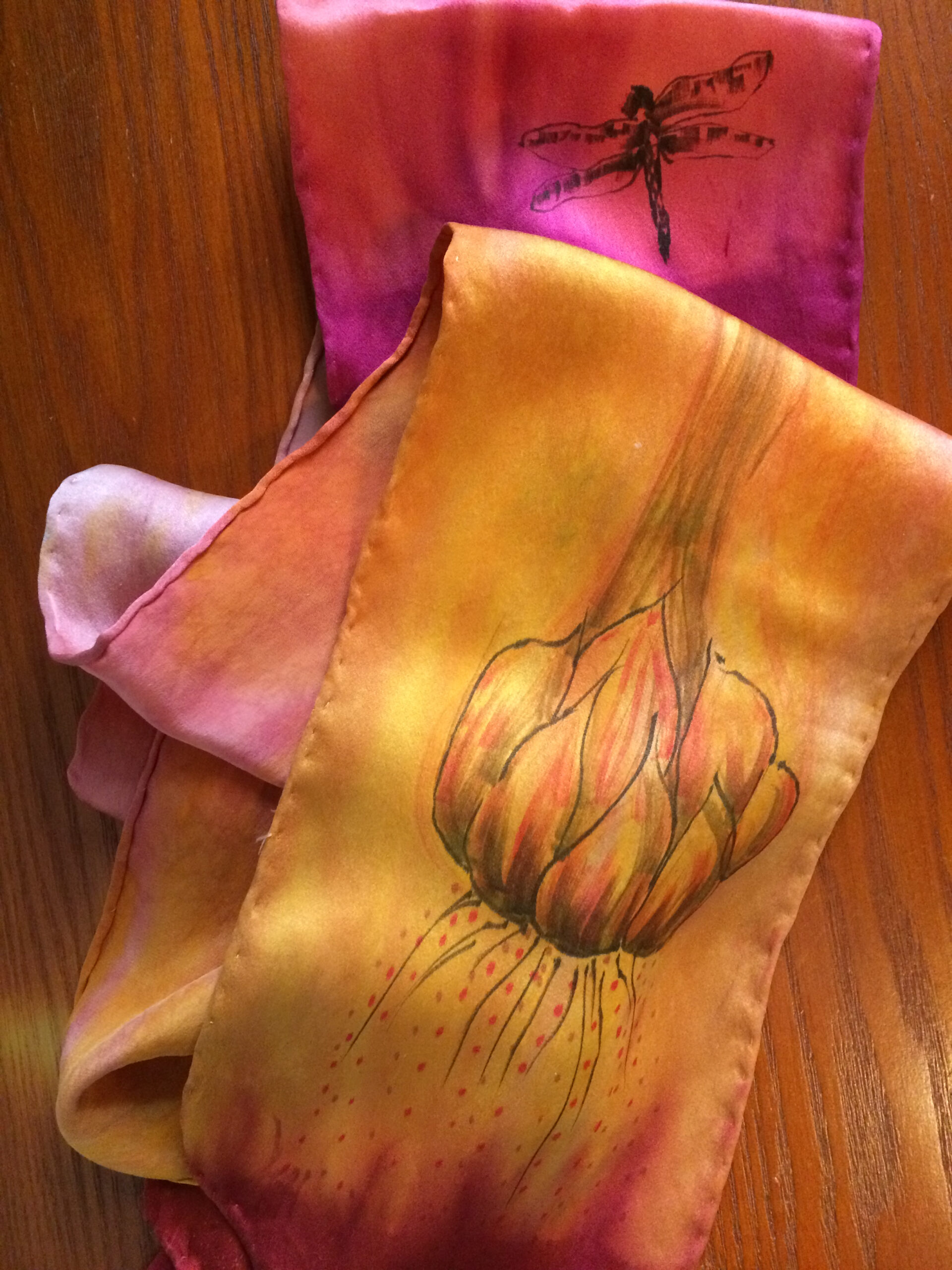 The silk painting on the scarves is a very different process than batik. As with batik the fabric, the silk is washed well before I begin the dyeing and painting.