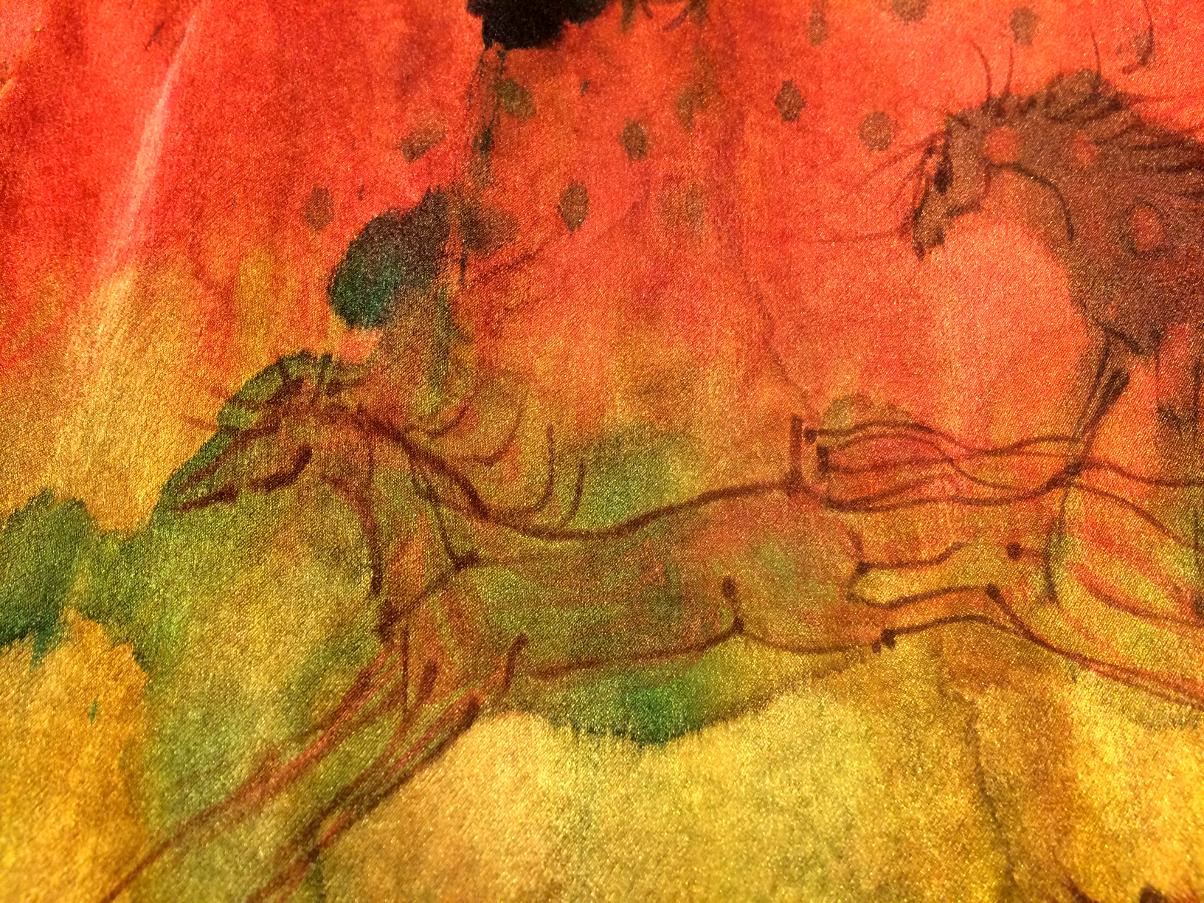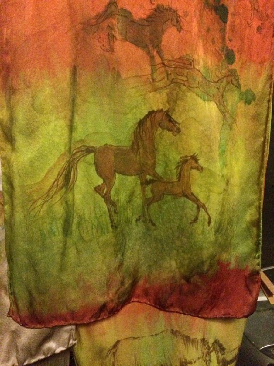 My good friend Kate Austin-Avon suggested that I should have captured Singer’s paw print on paper first, but I had none handy and am not that fast a thinker. At any rate the Mare and Foal scarf has Singer’s touch added to it. I have always said that I am an intermediary as I create my art. With batik the wax spreads and has a mind of it’s own. Dyes interact differently as the colors overlap and I take what comes and roll with it. For this silk scarf Singer helped me create!