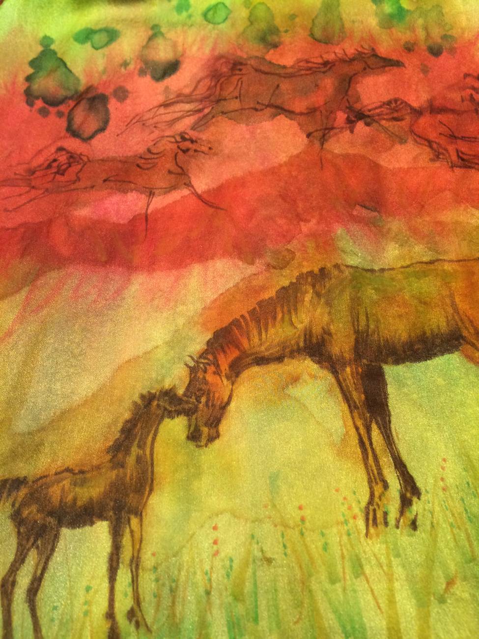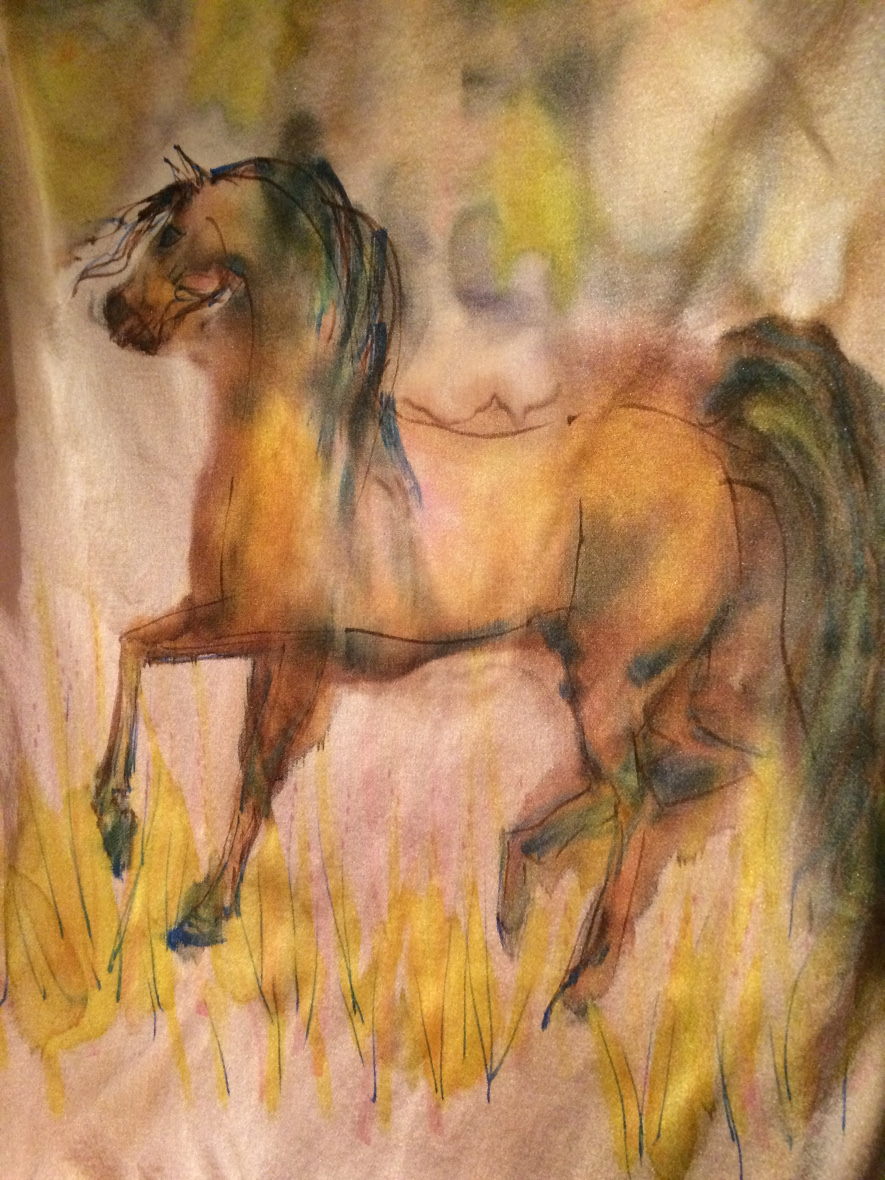 The other night in my studio my cat Singer was watching me paint on the scarves and got carried away in the excitement. She stepped forward into one of the small dishes of blue green silk dye. I watched her small paw go in and with brush in hand I lifted my poor kitty by the scruff of her neck up and away from taking the next step. The blue green dye splattered to the scarf I was working on (“Mare and Foal on a New Day”).