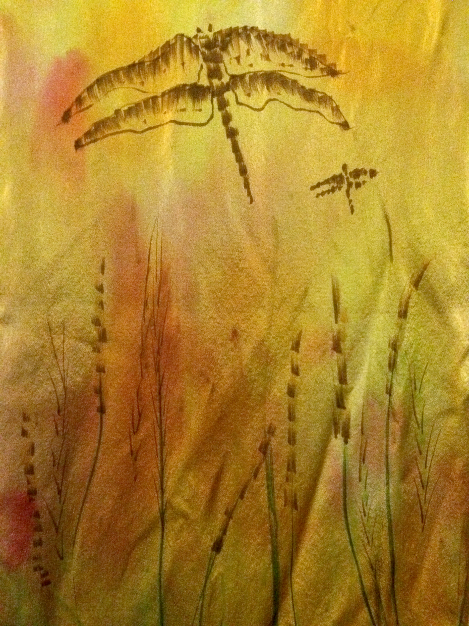 I have found a few cleaners I can use to lessen the colors as I like ethereal floating effects. After that I examine the scarves to find what is revealed in the abstractions of the early dyes. I paint on silk as a watercolor technique using silk dyes and can add some details with fabric markers. At the end the scarves are rinsed and put in a pail of silk dye set where they are circulated for five minutes before being washed out, dried and then carefully ironed.
