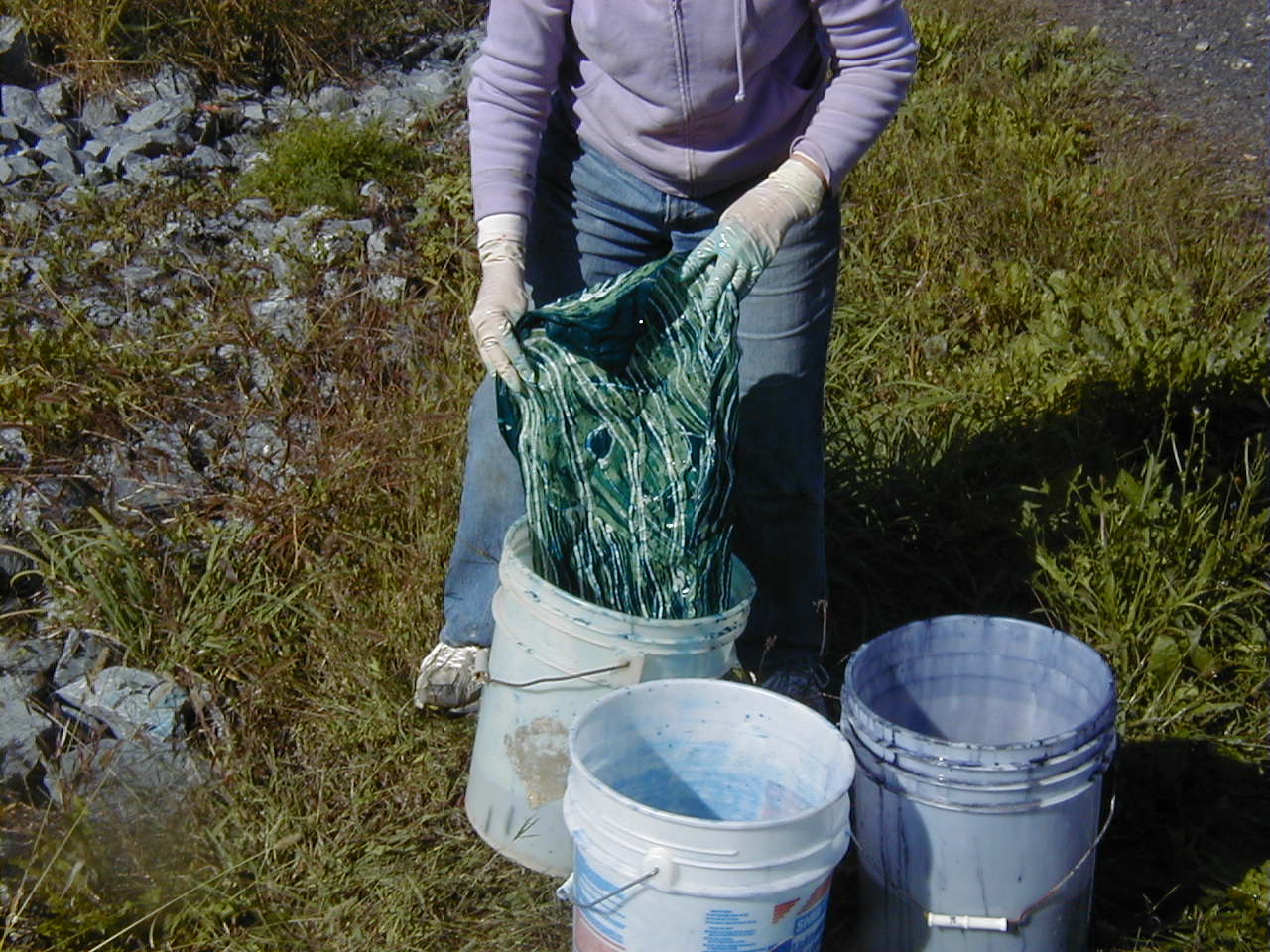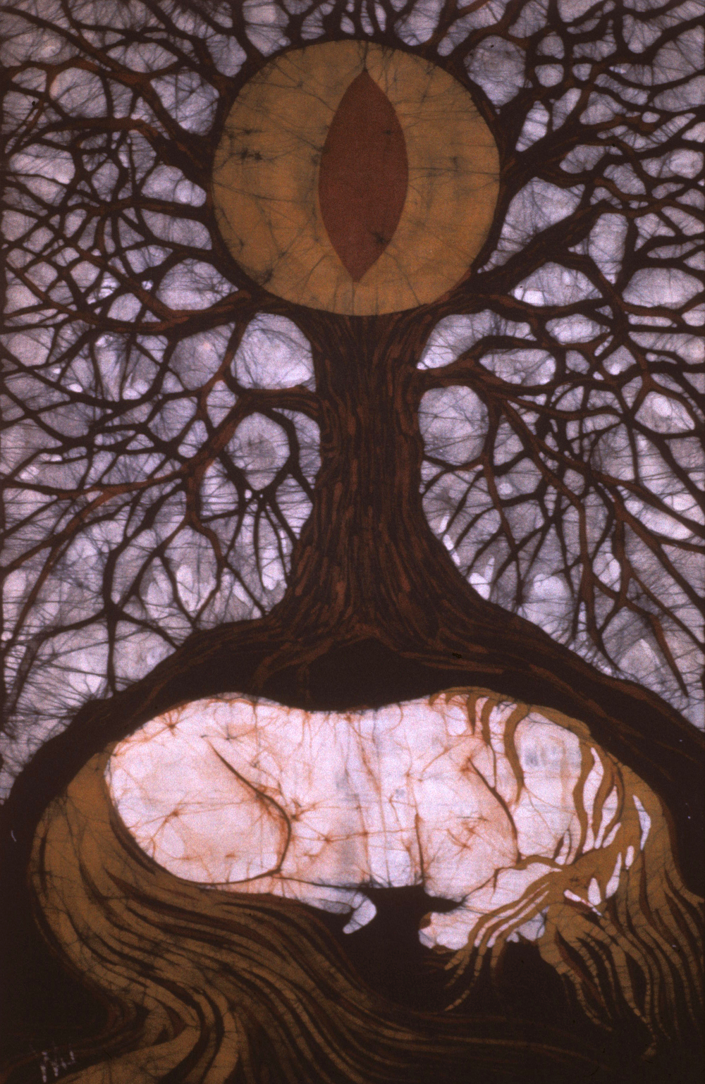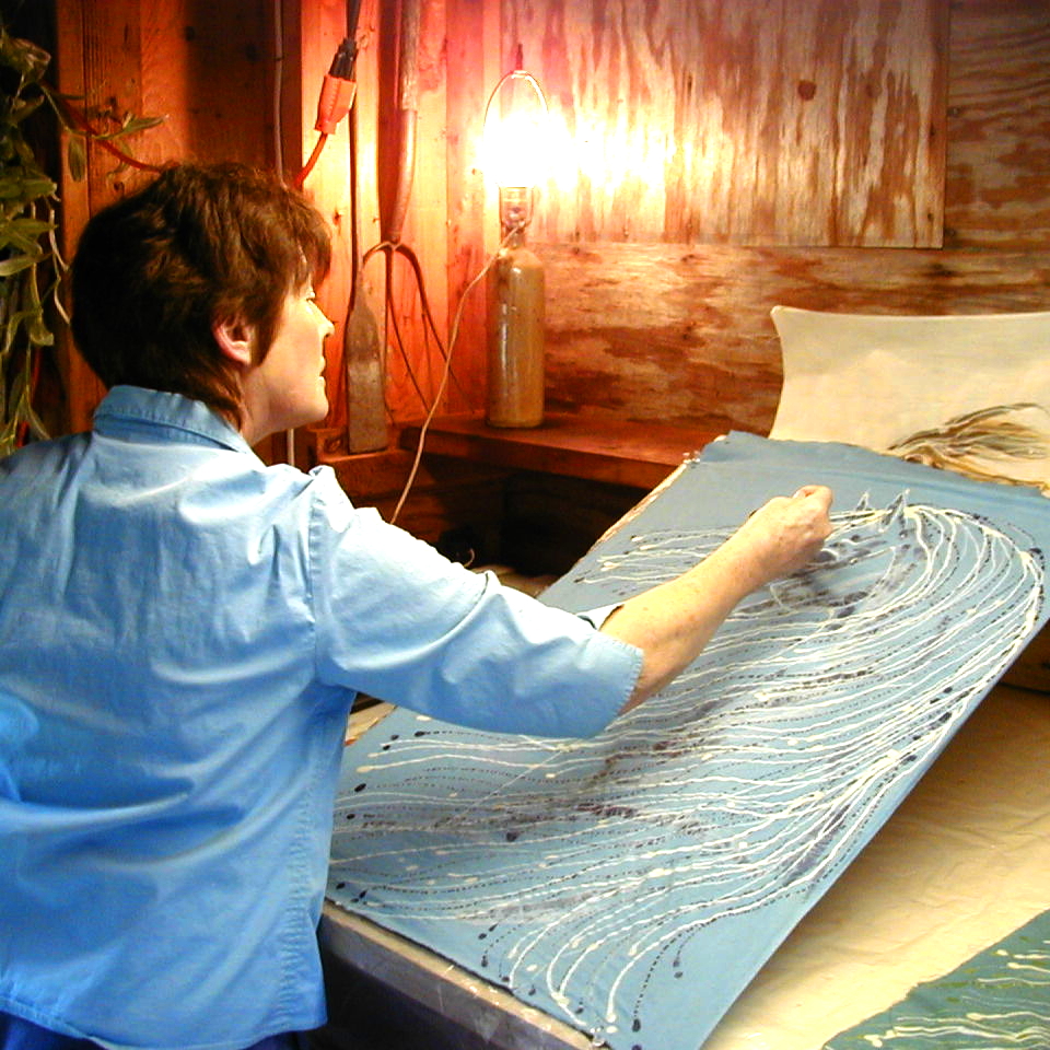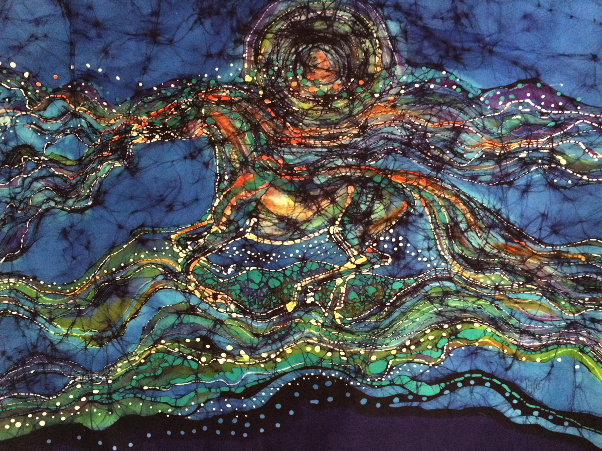 But the whole process is a great interaction of what comes out through my hand and what the dyes give me. The dyes themselves are always changing. As you use them, color is pulled out, so your next dye bath out of the same bucket can be different, usually lighter. But that too is affected by the temperature of the dye and how long the fabric is left in the dye bath. So when I finish a batik I feel that the spirits of wax and dyes have helped me to create this. As I iron it out, I enjoy how bright it looks, and it always makes me excited to see the finished design.