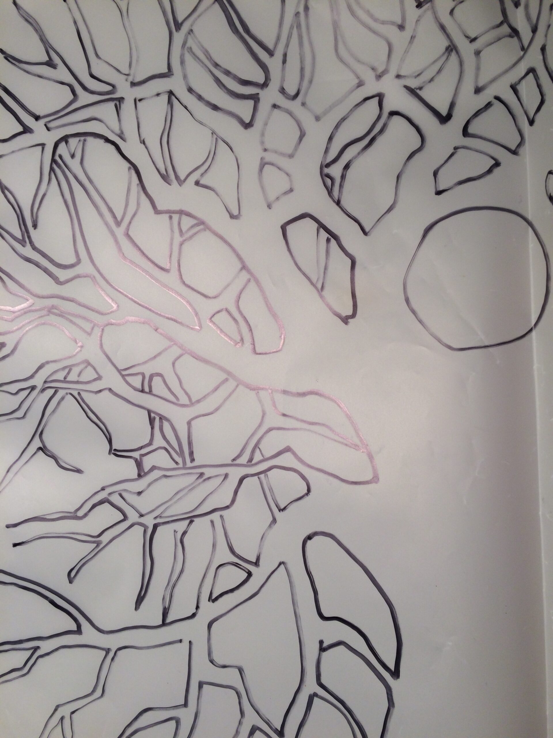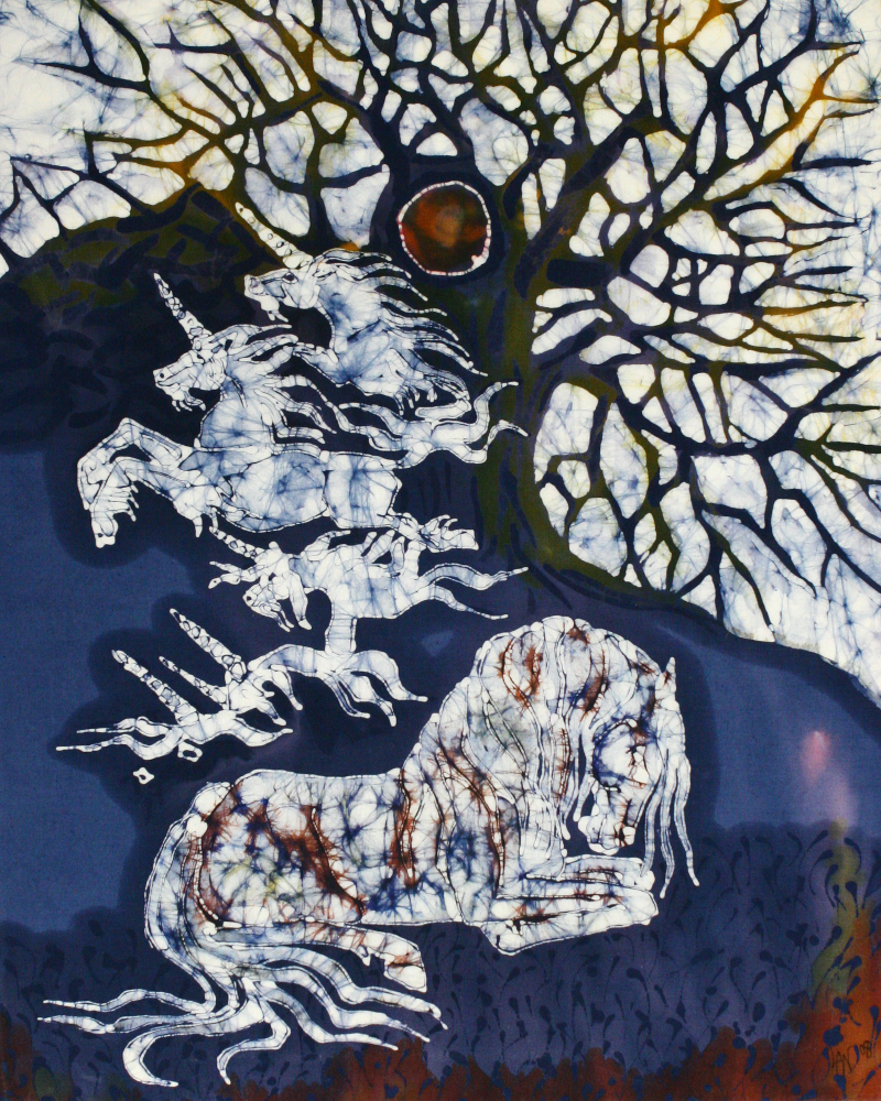 When this type of batik happens, I need to paint the sky around the tree branches with wax. So I am painting the negative space, and the branches are left behind unpainted to accept the dye. This is one of the aspects of batik that the printmaking process I did in the past really helps. So you can see in the pictures here how I trace the branches out on the fabric and transfer them to the cotton and am then ready to paint in the empty areas around the branches with plain white wax. The most famous of the batik with this design are Unicorns Rise from Dreams, and also Horse Sleeps Below Tree of Rebirth. It was essential that I plan these out very carefully. Some of my other batik have parts of it planned to detail and other parts left for a slow development of the design as the process moves on.