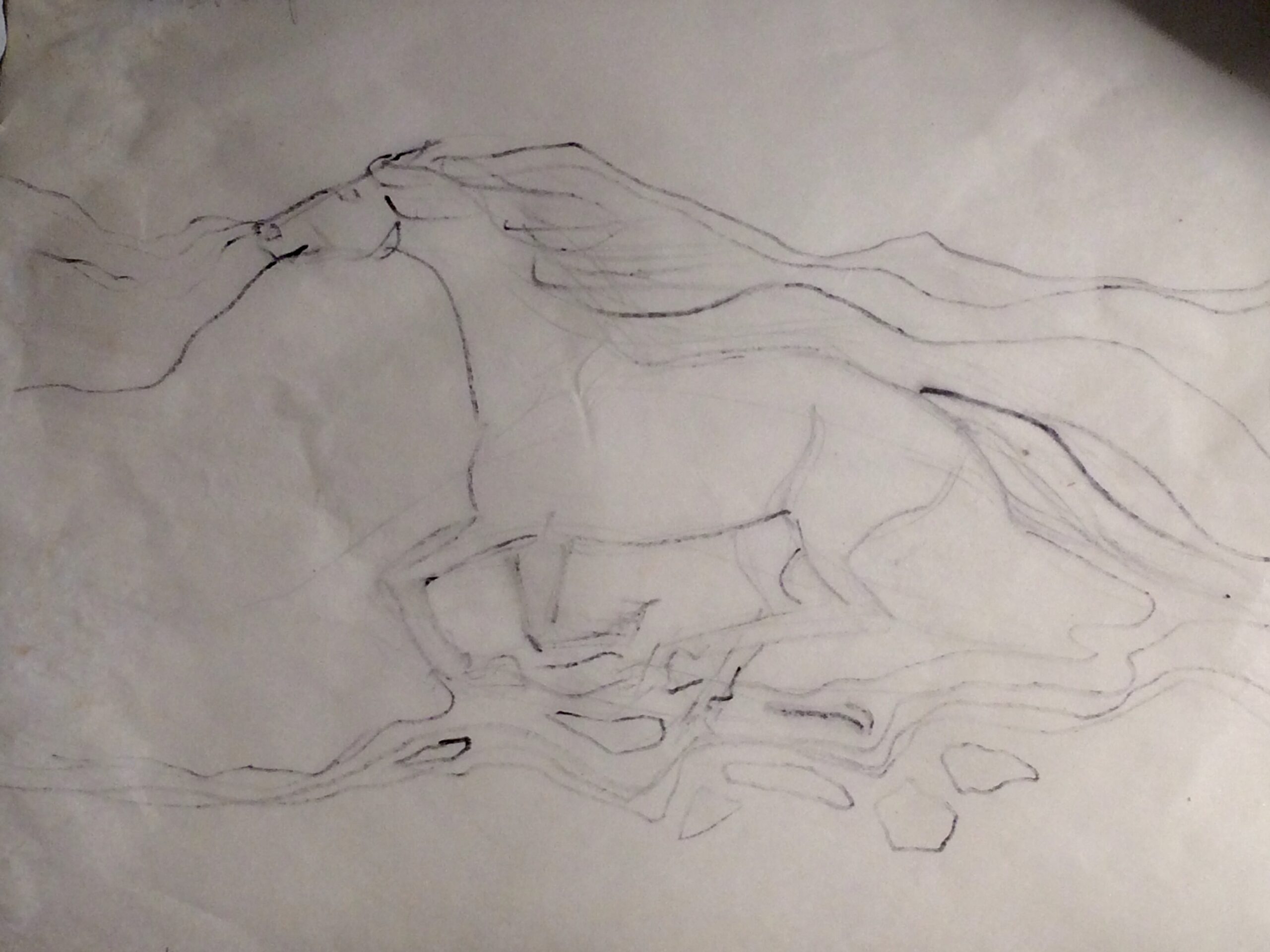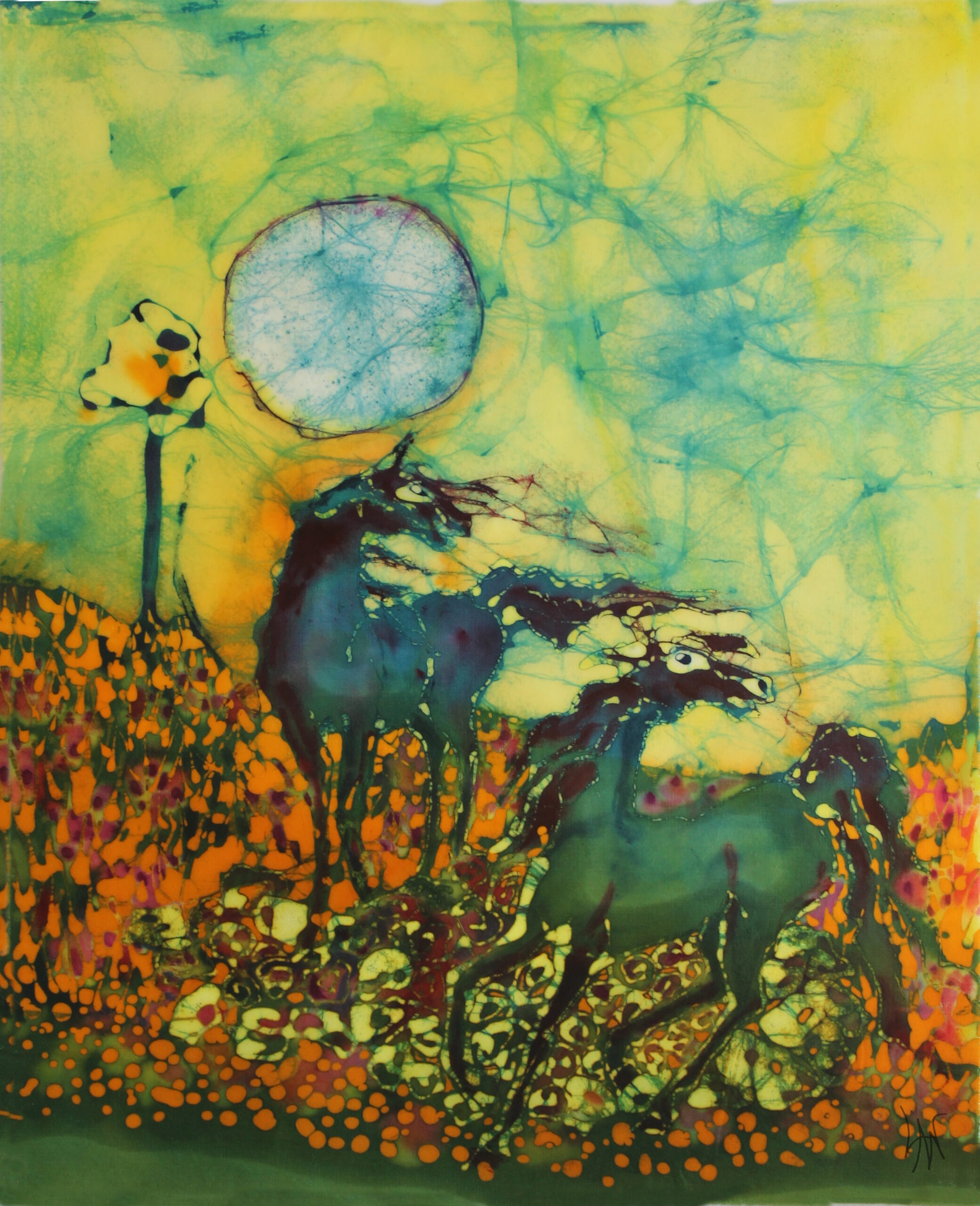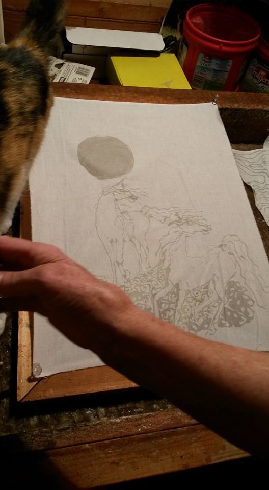 The tjanting is ideal for making spontaneous flowing lines. I do plan the batik with a light sketch, but the tjanting tool has little to do with the lines that a pencil will make. It needs its own space, and defies being held to rigid forms. I especially like to do horses with the tjanting tool as the manes and tails catch the elements of the wind and breath and movement of the horse. The tjanting creates an image of the spirit of the horse and the movement, and is very ethereal, but the horses are not solid at all. They are part of the wind. I will add many stages of the tjanting lines to build up a batik in many colors of flowing manes and sometimes tails. And you can see some of the progress in the photos that I’ve included here.