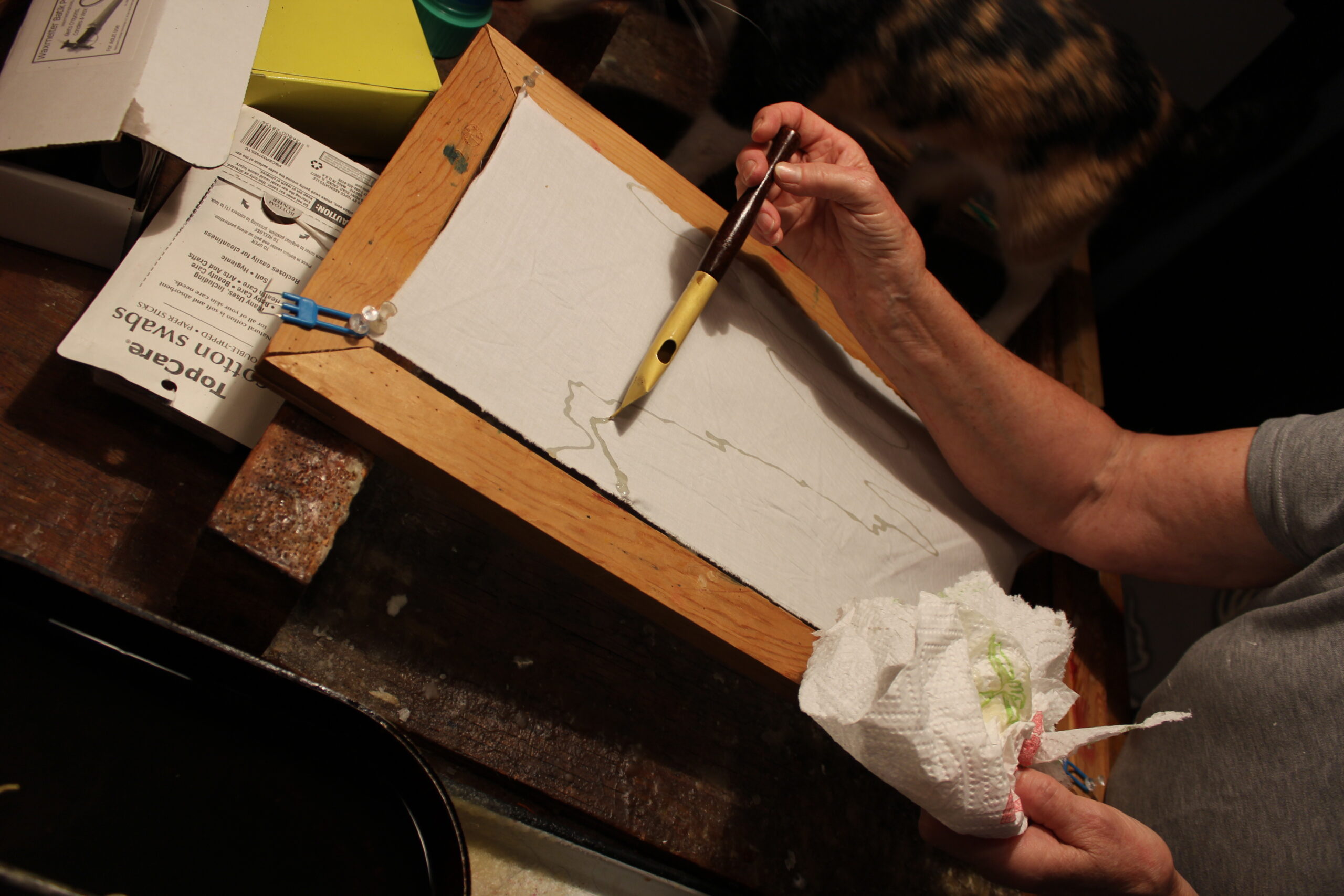 Many people ask me where my inspiration comes, and how do I plan my designs for my batik artwork. I have two different ways of approaching a batik. Some of my batiks are done mostly with the tjanting tool, which is a brass or copper bowl with a spout. The tjanting is a very ancient tool and makes lines of wax. The wax flows out very quickly and I always need to have a cloth or a paper towel nearby to catch the drops that I don’t want to fall on the fabric until I place it down and start to draw.