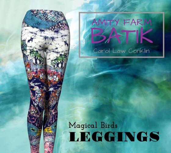 I have been working with Kate Austin-Avon for years. Kate has created my website, helped set up my Etsy shop, and so much more. This year we have worked together on adding my batik images to clothing, quite a challenge! There are now dresses, scarves, headbands, leggings and capris with my wild and mystical art as the design. When I dropped off my artwork for the Bedlam Farm Open House held on the weekend of the 10th and 11th of June, I found Maria in her studio rearranging all to make a gallery out of her studio. She took the photo you see at the top of this page.