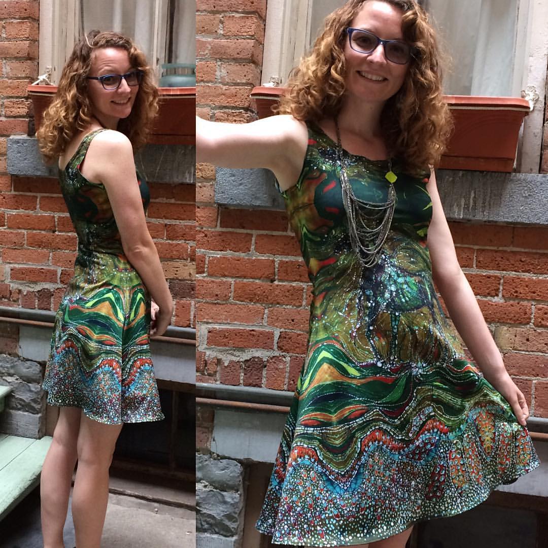 The Magical Frogs on the leggings that I bought look a lot different than the ones that Kate is wearing. My frogs are plumper and very happy, healthy like a plump Buddha. The frogs that Kate is wearing are sleek and long, kind of matching her frame and personality. Maria jumped on this and added that each piece of clothing was becoming a personal sculpture on the person who wore it, a three dimensional image, and as my art often stems from ancient images from the mythical past, each one would become a mythical goddess image. (Take a look at Maria’s work and you will know what she’s talking about.)