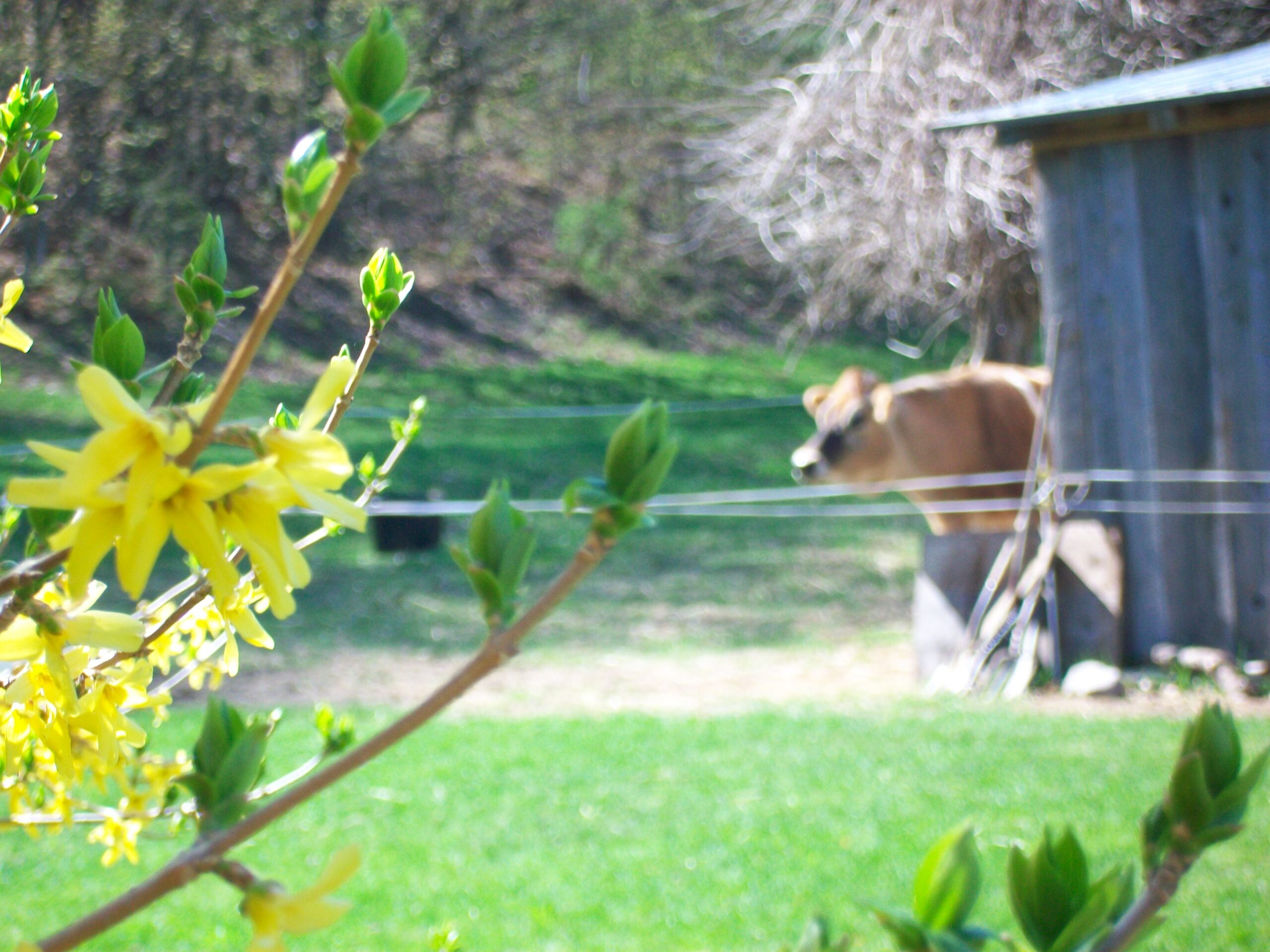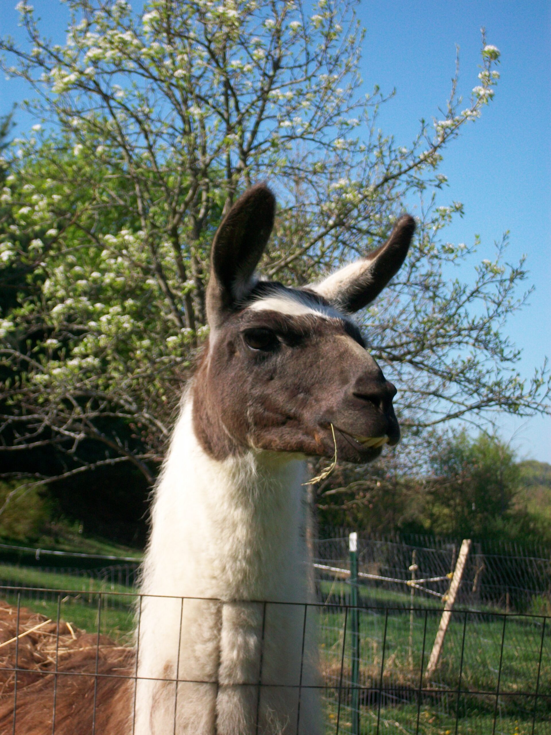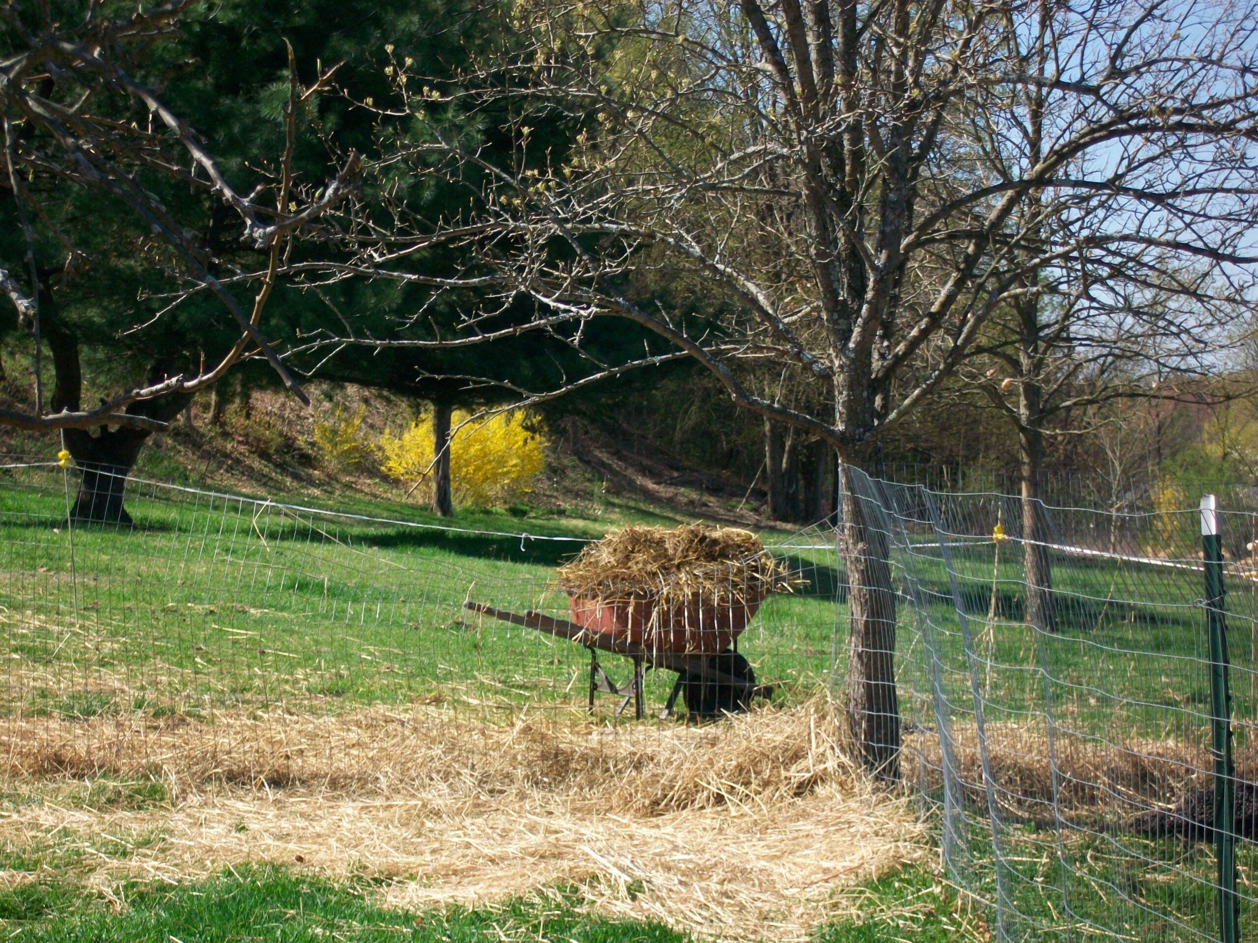 Days are longer and brighter in spite of the frosty mornings that have kept spring grasses and leaves from sprouting. Now, at last in May, the sunlight warms our hearts and that of my critters. Steppin looks out on the day and likes what she sees. The wheelbarrow has been running full force with lots of loads to the compost at the end of the field. Vanilla chews quietly by the pear tree and looks out over all in his garden pose. The hills and valleys still will take time to green up, but they are beautiful, clear and showing sections of buds on the trees. It won’t be long before I’ll be able to get my dye buckets out and be happily dyeing my fabric with these two watching what I do.